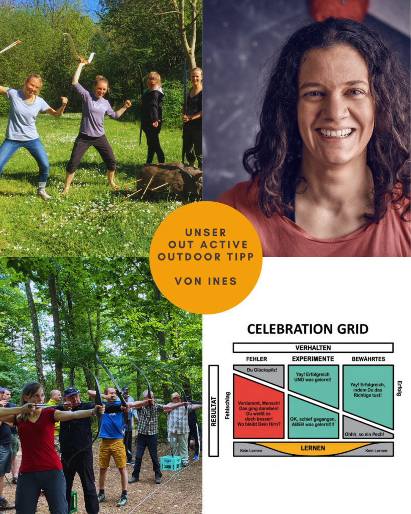 In unserer Arbeit integrieren wir gerne hilfreiche Theoriemodelle, um Teams in einem handlungsorientierten Umfeld zu unterstützen. Bei uns geht es darum, mit Spaß, Herz, Hand und Verstand neue Lernfelder zu eröffnen. Bogenschießen kann mehr sein als nur ein spannender Sport. Wir nutzen es, um praxisnahe Lernfelder in den Bereichen Geduld, Präzision und vor allem im Umgang mit Fehlern und Erfolgen zu schaffen. In unseren Veranstaltungen setzen wir Bogenschießen nicht nur als Herausforderung für den Einzelnen ein, sondern verbinden es bei manchen Teams auch mit dem „Celebration Grid“ – einem Theorie-Modell, das das Lernen als zentralen Bestandteil des Fortschritts in den Vordergrund stellt. So wird das Team aktiv in den Lernprozess eingebunden, und der Fokus liegt auf der praktischen Anwendung des „Celebration Grid“, das durch eine strukturierte Reflexion den Lernprozess fördert.