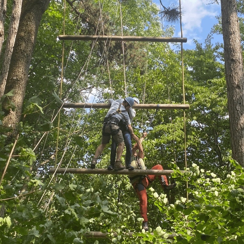 Beim Seilbrückenbau steht die Zusammenarbeit im Fokus, während die Gruppe gemeinsam eine Brücke aus Seilen und Karabinern über eine Schlucht oder einem Fluss baut und das Bauwerk anschließend gemeinsam testet.