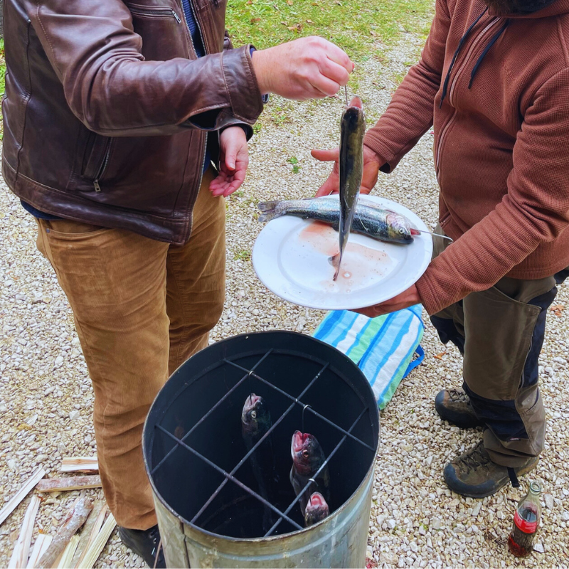Eine andere Gruppe widmete sich der Herausforderung, Forellen in großen Dosen zu räuchern. Mit etwas Geduld und Experimentierfreude wurden die Dosen schließlich in die Glut gestellt, und schon bald konnten auch die geräucherten Forellen als köstlicher Appetizer die Runde machen. Es war faszinierend zu sehen, wie jede Gruppe ihre Aufgaben mit Hingabe und Teamgeist meisterte, aber immer wieder zusammenkam, um sich gegenseitig zu unterstützen.
