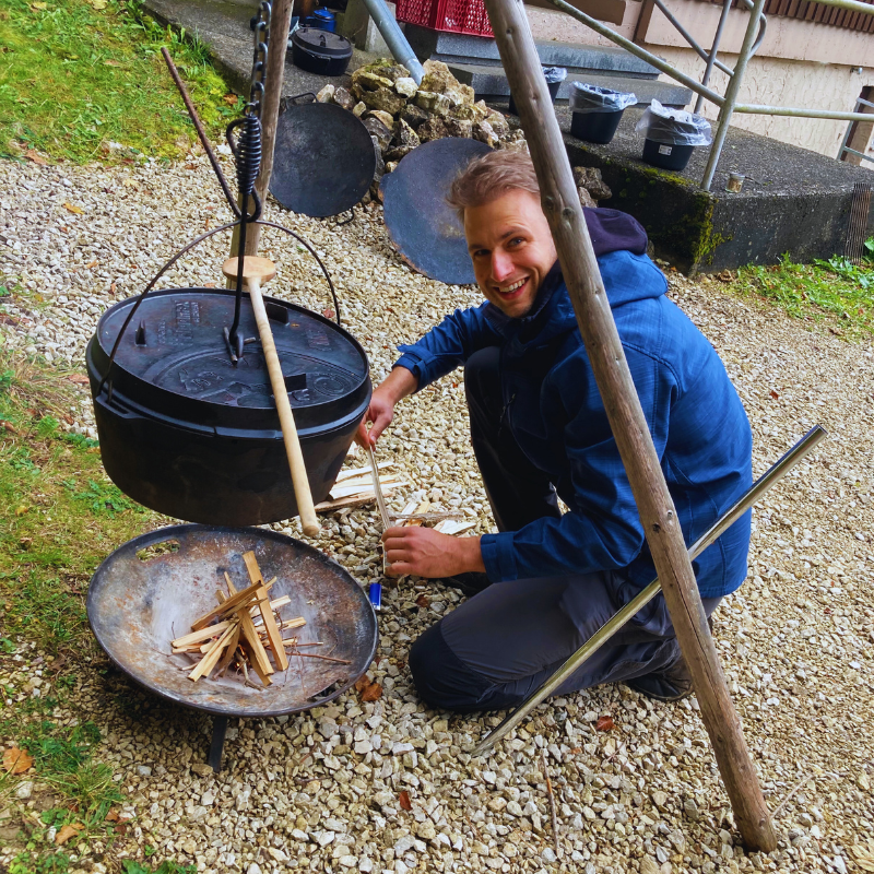 Die erste Herausforderung des Tages? Holz spalten und das Feuer entfachen! Diese Aufgabe erforderte nicht nur handwerkliches Geschick, sondern auch eine enge Zusammenarbeit. Während ein Teil des Teams sich um das Feuer kümmerte, organisierte der andere Teil die Zutaten und berechnete die benötigten Mengen für die Rezepte. Es dauerte nicht lange, bis an jeder Feuerstelle emsig gearbeitet wurde, gelacht und sich ausgetauscht wurde.