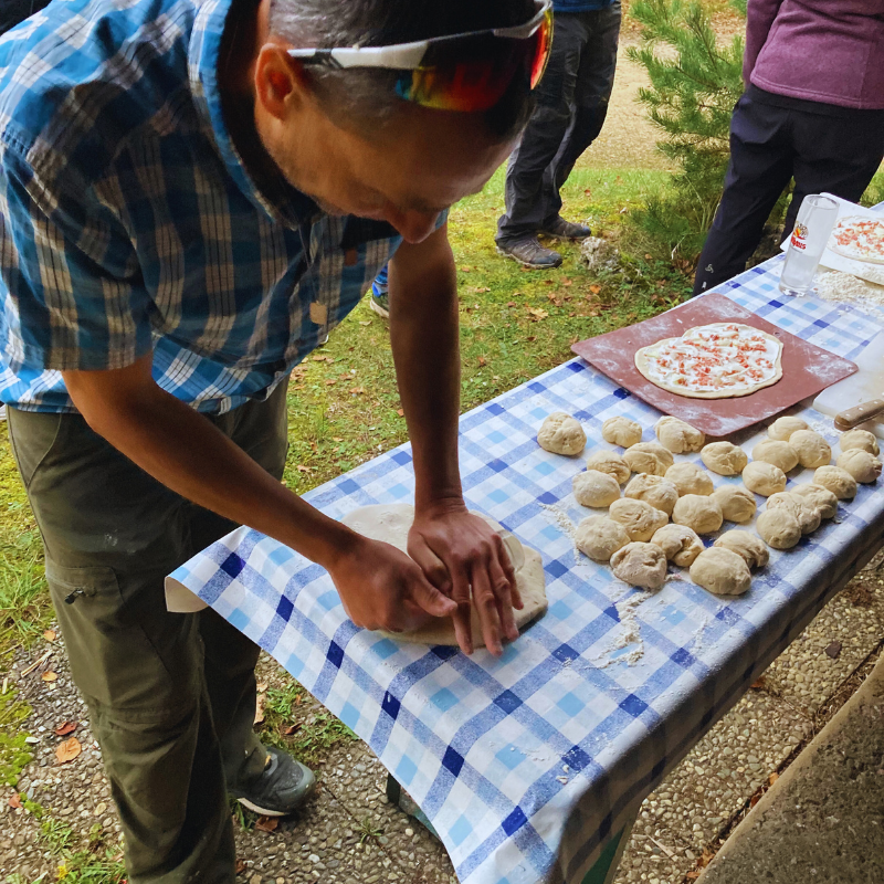 Der Flammkuchenofen wurde befeuert, und bald schon konnten die ersten Flammkuchen belegt werden – eine kleine, aber köstliche Zwischenmahlzeit, die allen sehr gut schmeckte. Die Begeisterung war groß, und jeder konnte seine Wunschbeläge äußern.